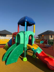 Жаңадан салынған ойын алаңы барлық талапқа сай: сырғанақтар, әткеншектер, ойын кешендері, карусельдер, құмсалғыш және қауіпсіздік жабындысы бар. Аумағы толық қоршалып, демалатын орындар жасалған.