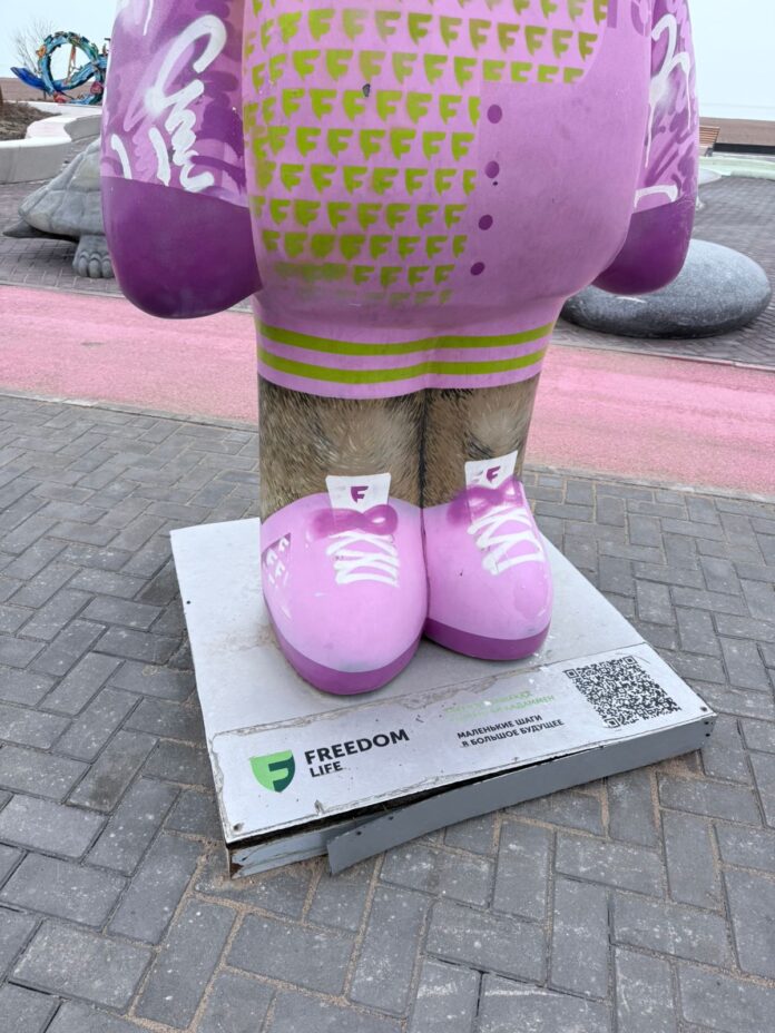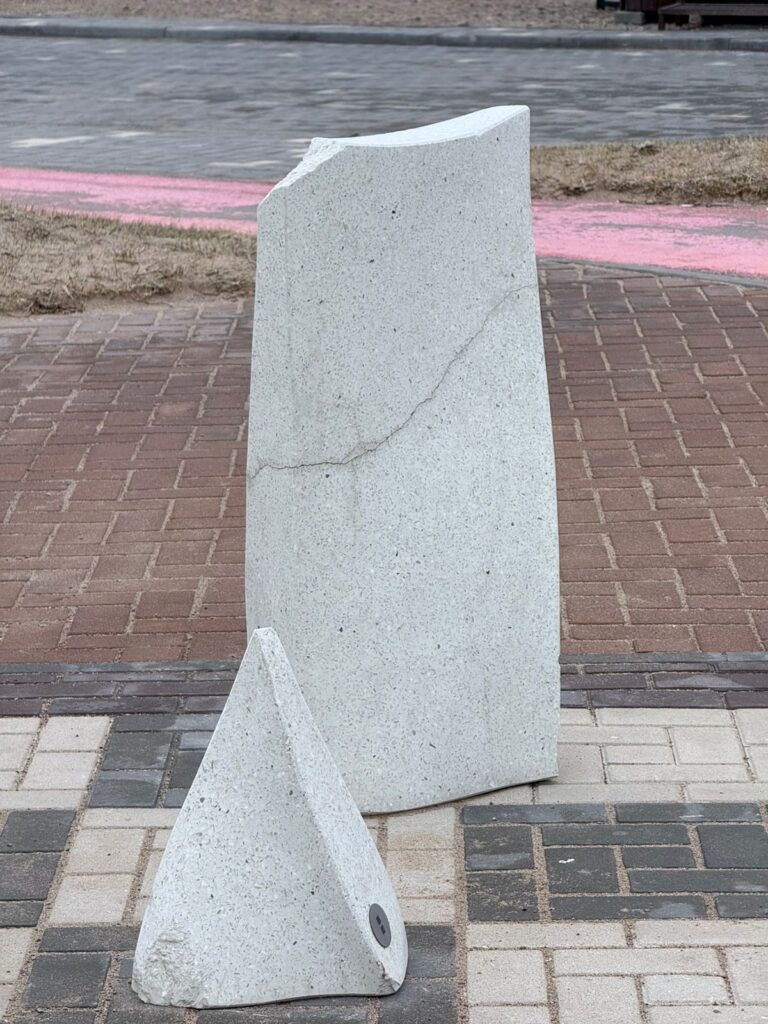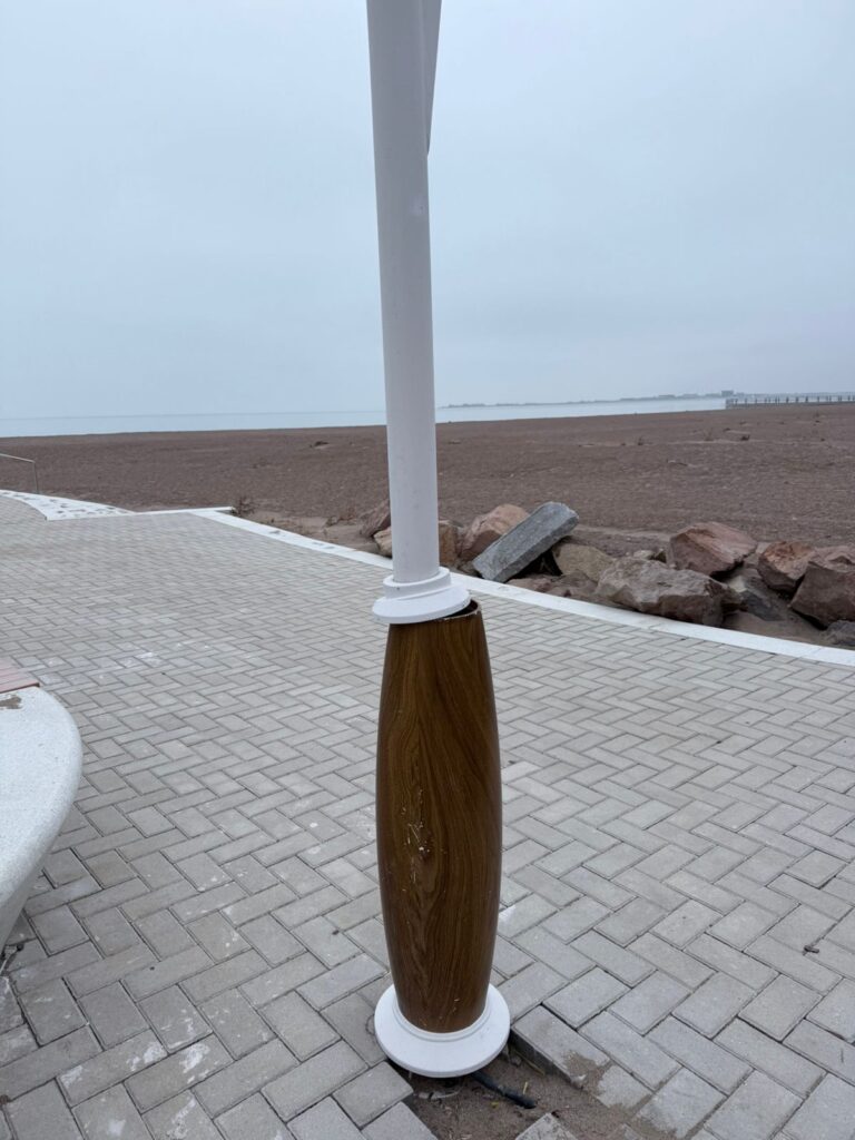 На снимках с побережья Капшагайского водохранилища — городской набережной и пляжной инфраструктуры, благоустроенной при участии компании Freedom Finance, — зафиксированы сколы, повреждённые элементы опор освещения, трещины на инсталляциях, дефекты у основания арт-объекта. По словам автора, кадры сделаны уже в 2026 году.