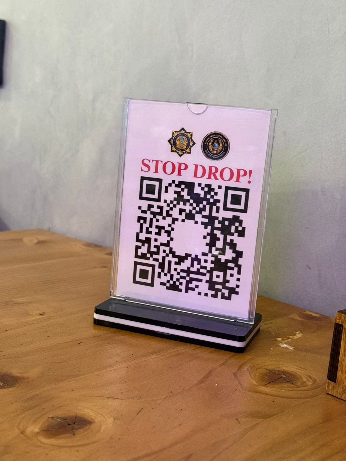 В одном из заведений города Конаев была замечена информационная табличка с надписью STOP DROP! и QR-кодом, предназначенным для передачи сведений о фактах незаконного оборота наркотиков.
