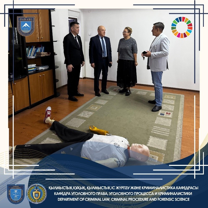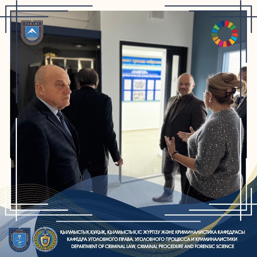 Делегацию приняли заведующая кафедрой уголовного права, уголовного процесса и криминалистики, доктор юридических наук, профессор Джансараева Рима Еренатовна, а также декан юридического факультета, кандидат юридических наук, профессор Ахатов Уалихан Акыпбекович.