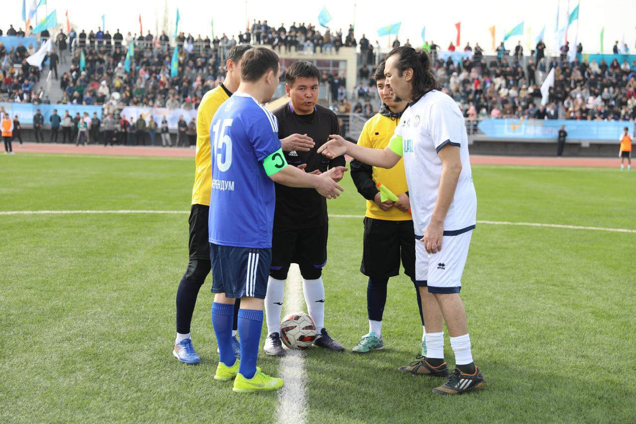 Футбол алаңында екі команда бақ сынасты. «Қонаев» командасында балуандар — Париж Олимпиадасының жүлдегері Демеу Жадыраев, Бейжің Олимпиадасының күміс жүлдегері Нұрбақыт Теңізбаев, Лондон Олимпиадасының қола жүлдегері Ақжүрек Таңатаров, әлем чемпионатының жүлдегерлері – Нұржан Жұмажан, Ербол Қоңыратов, Қорлан Жақанша, айтыскер ақын Сырым Әуесхан, «Qonaev media» теларнасының жүргізушісі Қосқанат Көпжасар және өзге де танымал азаматтар өнер көрсетті.