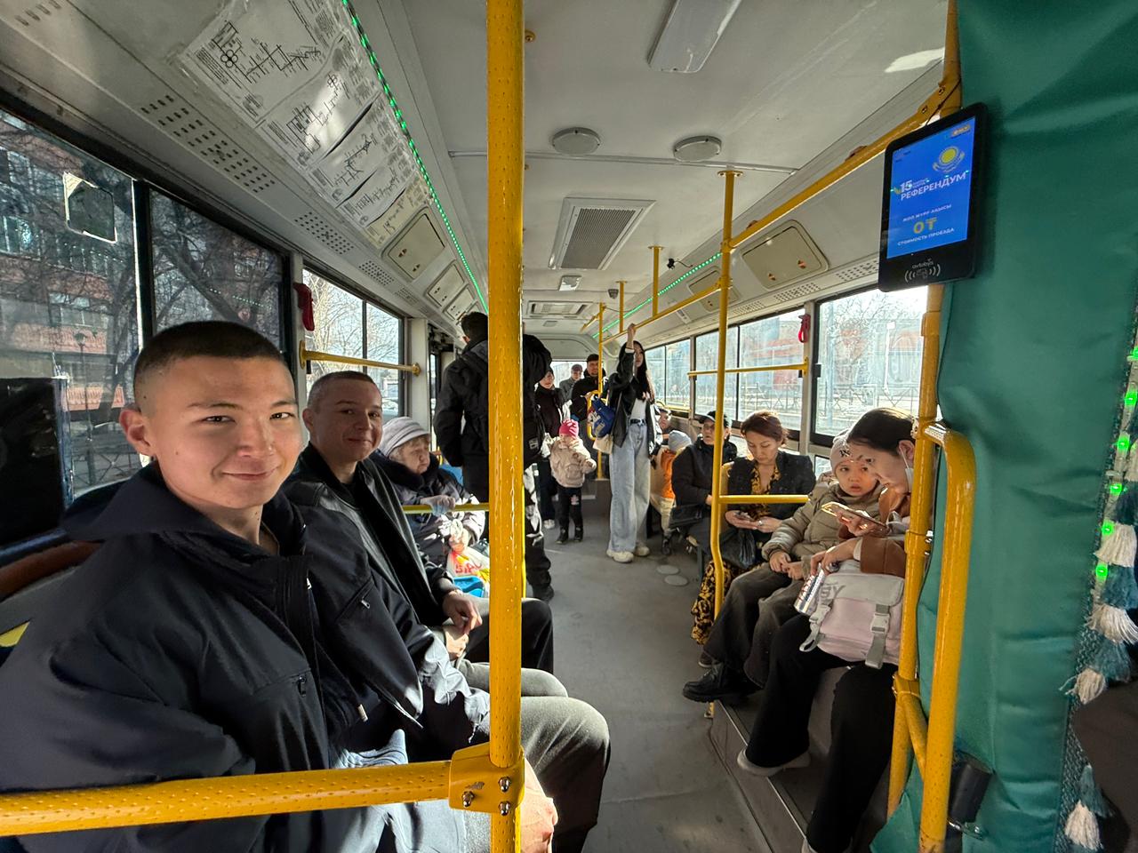 Республикалық референдум күні Қонаев қаласында тұрғындардың дауыс беру учаскелеріне кедергісіз жетуі үшін қоғамдық көлік тегін қызмет көрсетті.