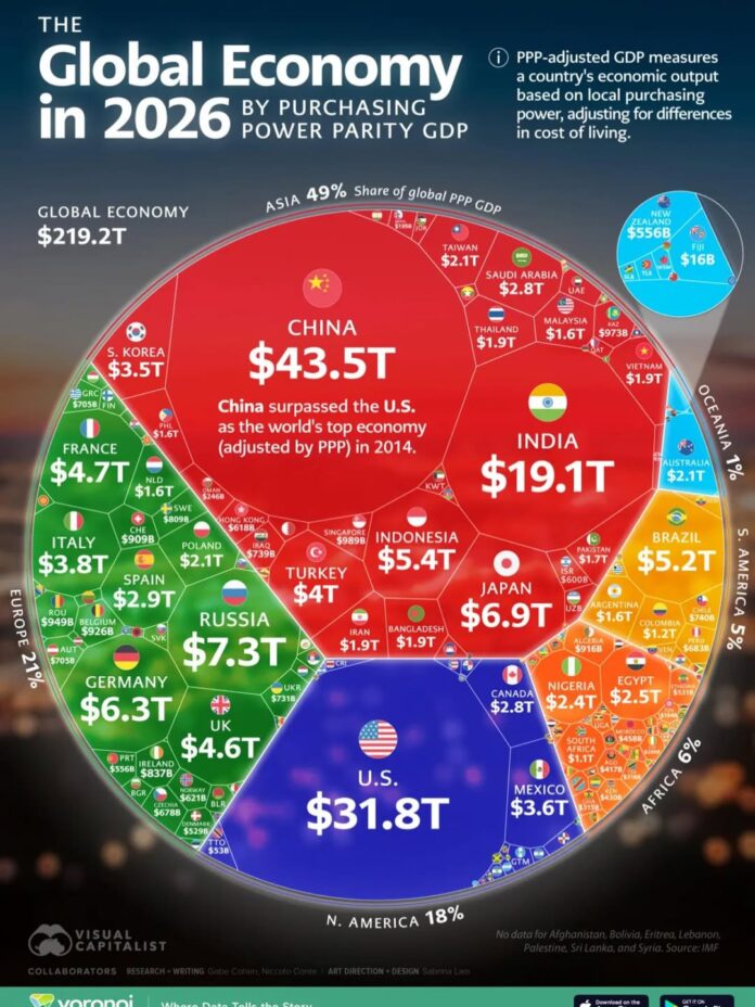 Общий объём мировой экономики по этому показателю достиг 219,2 трлн долларов, при этом почти половина глобального ВВП приходится на страны Азии.